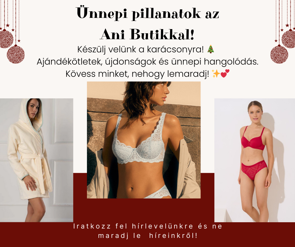 Az Ani Butikban olyan gazdag és varázslatos választékkal várunk, hogy pillanatok alatt megtalálhatod a tökéletes ajándékot bárkinek, akit szeretnél meglepni. Legyen szó elegáns fehérneműről, kényelmes hétköznapi darabokról vagy különleges, ünnepi meglepetésekről – nálunk minden korosztálynak jut valami szépség és csoda.